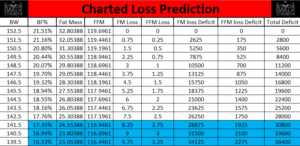 With this information, we can piece together tangible information about how to achieve body composition goals. An individualized chart will be prepared for each subject entailing caloric requirements to reach certain body composition measures. E.g.,