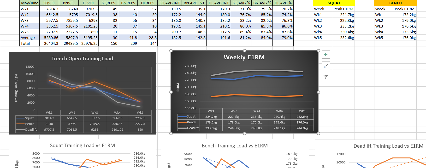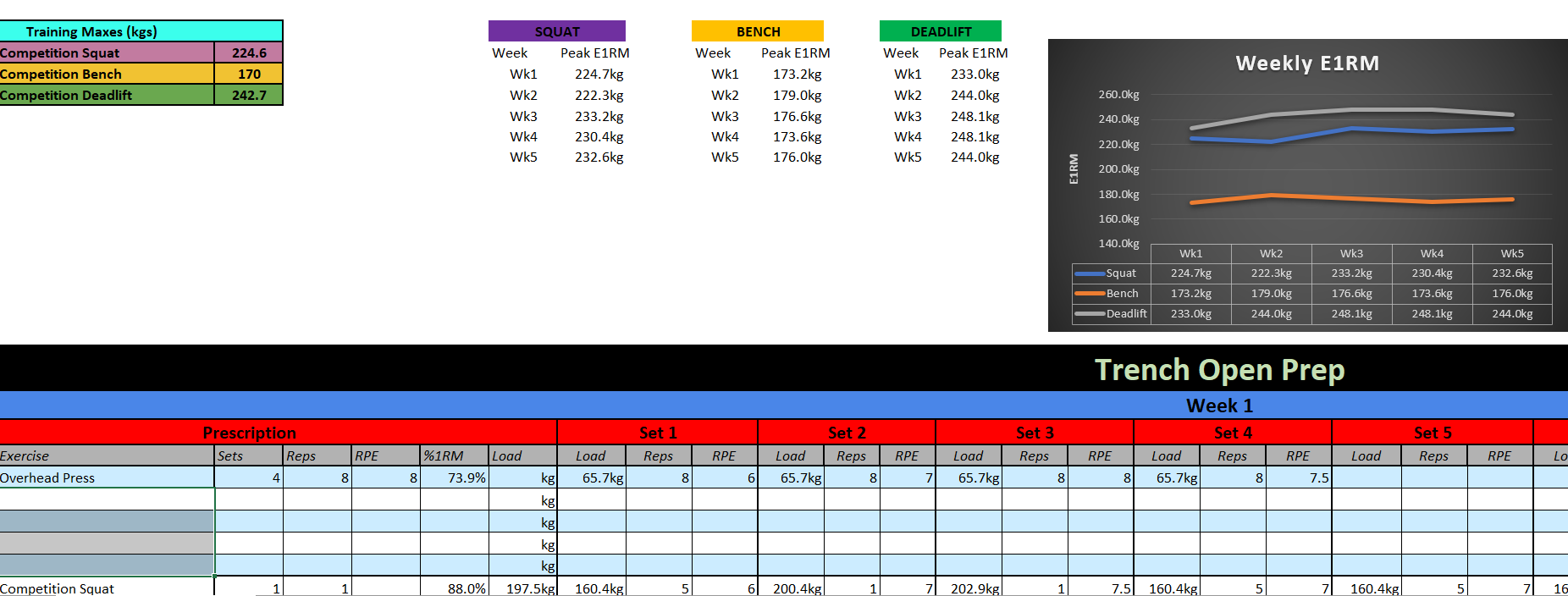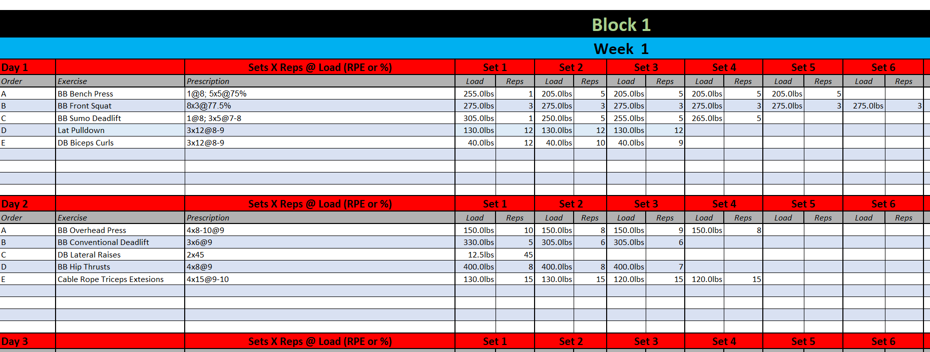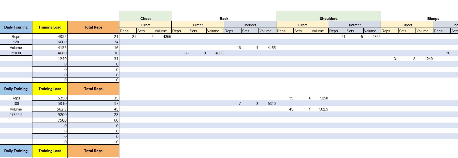 Example 1: template for bodybuilders looking to track training volume by body part. The template provides the base for tracking, but programming is fully customized.